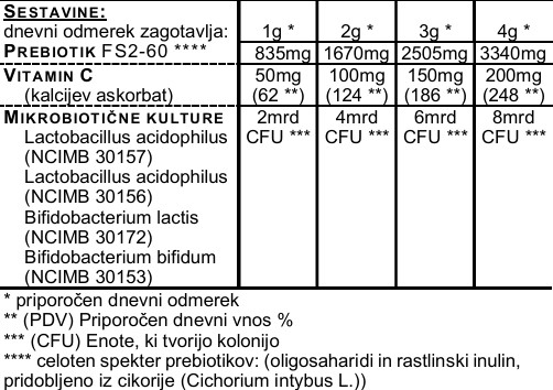 Simbiotična otroška mešanica v prahu vsebuje tudi vitamin C, ki ima pomembno vlogo na številnih področjih človekovega zdravja. Vitamin C prispeva k normalni tvorbi kolagena, za normalno delovanje kosti, hrustanca, kože, dlesni in zobovja. Vitamin C pomaga vzdrževati imunski sistem in prispeva k normalnim psihološkim funkcijam.